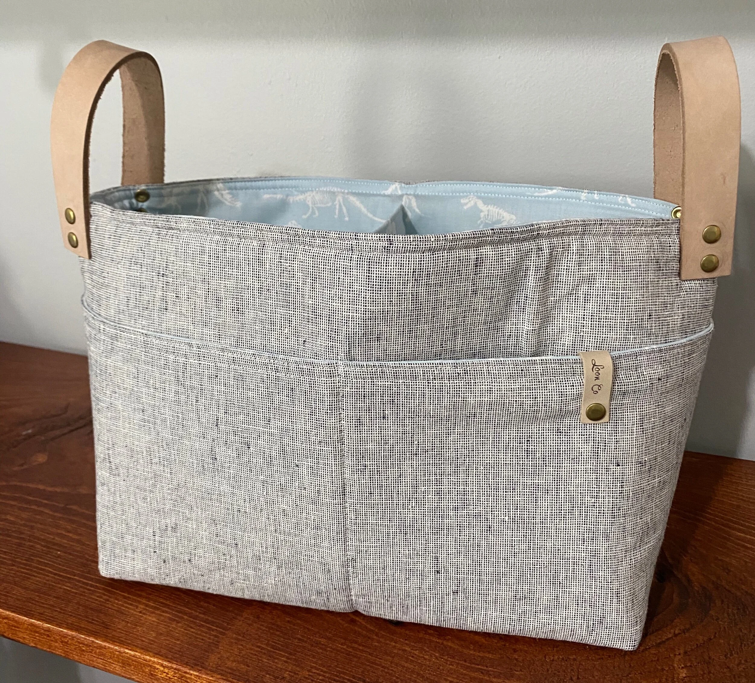 The pattern is from one of my fav designers, Noodlehead. I discovered Anna’s (maker/founder of Noodlehead) work quite a while ago, and stalk her blog quite frequently, however this is my first make from one of her patterns! If you are a maker yourself, you must be sure to check out her site, you will not be disappointed! For this piece I chose a slub linen cotton woven blend in a darker navy/gray/black blend for the exterior, and for the interior I chose the cutest little dino fabric! For the handles I altered the pattern a little bit because i wanted to use leather and rivets, I love leather and metal hardware! Enjoy below, let me know if there is any interest to add a piece like this to the shop!