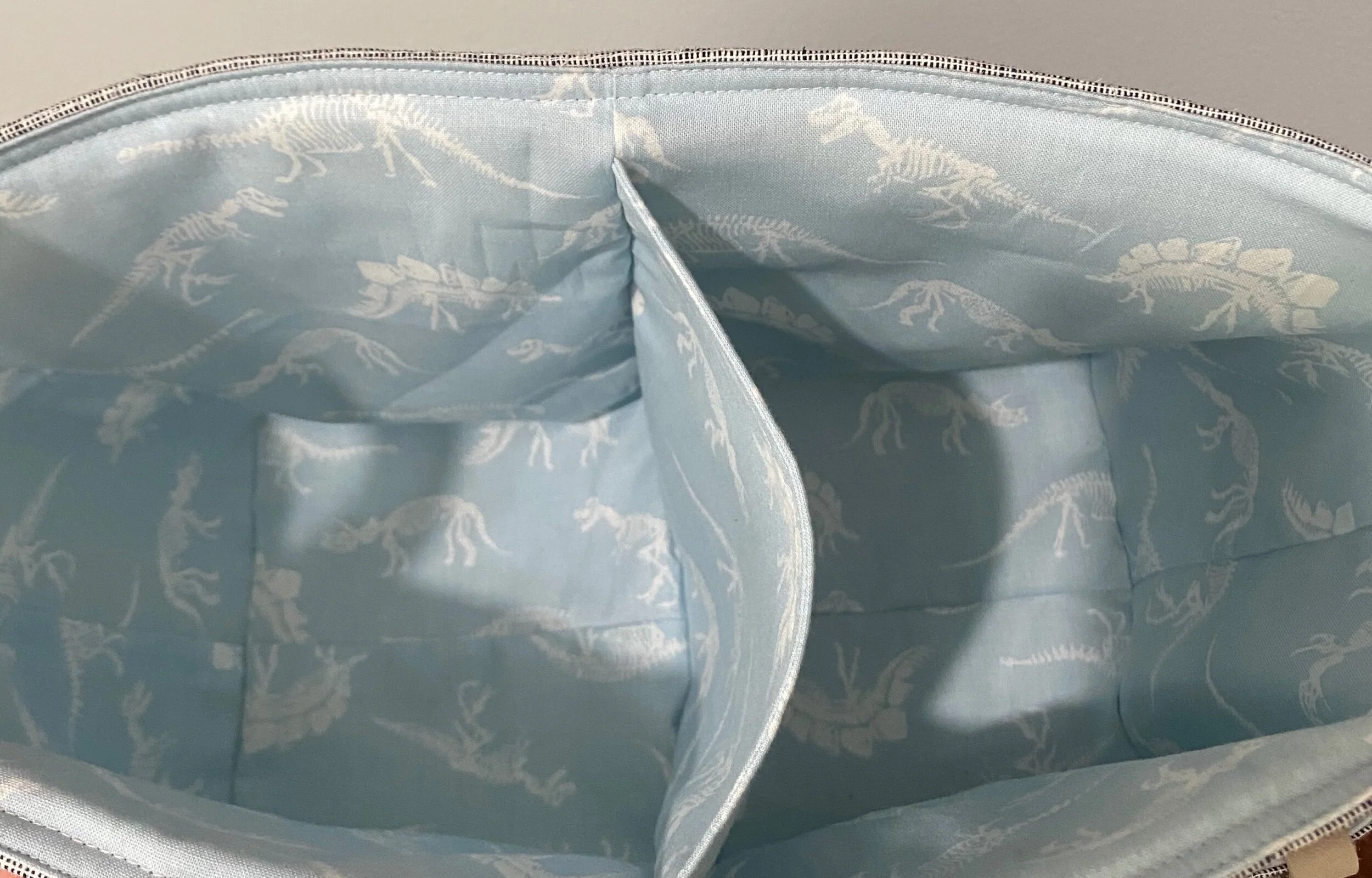 Fabric: Hawthorne Fabric Supply (exterior is Essex Yarn Dyed Homespun by Robert Kaufman, interior is Fossils in Splash by Dear Stella)